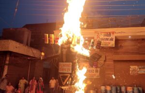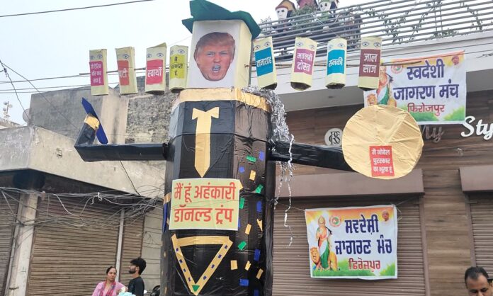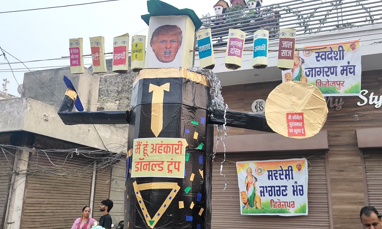 ਫਿਰੋਜ਼ਪੁਰ ਵਿਖੇ ਸਵਦੇਸ਼ ਜਾਗਰਣ ਮੰਚ ਨਾਮ ਦੇ ਸੰਸਥਾ ਵੱਲੋਂ ਦੁਸ਼ਹਿਰ ਮੌਕੇ ਅਮਰੀਕੀ ਰਾਸ਼ਟਰਪਤੀ ਡੋਨਾਲਡ ਟਰੰਪ ਦਾ ਪੁਤਲਾ ਫੁਕਿਆ ਗਿਆ। ਸੰਸਥਾ ਨੇ ਸ਼ਹਿਰ ਦੇ ਰਾਮ ਬਾਗ ਰੋਡ ’ਤੇ 10 ਸਿਰਾਂ ਵਾਲਾ 12 ਫੁੱਟ ਉੱਚਾ ਪੁਤਲਾ ਬਣਾਇਆ ਗਿਆ। ਇਸ ਸਬੰਧੀ ਜਾਣਕਾਰੀ ਦਿੰਦਿਆਂ ਸਵਦੇਸ਼ੀ ਜਾਗਰਣ ਮੰਚ ਦੇ ਆਗੂ ਡਾ. ਤਰੁਣ ਜੈਨ ਨੇ ਕਿਹਾ ਕਿ ਅੱਜ ਹਰ ਥਾਂ ਰਾਵਣ ਦੇ ਪੁਤਲੇ ਸਾੜੇ ਗਏ ਹਨ ਪਰ ਡੋਨਾਲਡ ਟਰੰਪ ਵਿ ਕਿਸੇ ਰਾਵਣ ਤੋਂ ਘੱਟ ਨਹੀਂ ਐ, ਜਿਸ ਦੇ ਚਲਦਿਆਂ ਰਾਵਣ ਦਾ ਪੁਤਲਾ ਫੁਕਿਆ ਗਿਆ ਐ।
