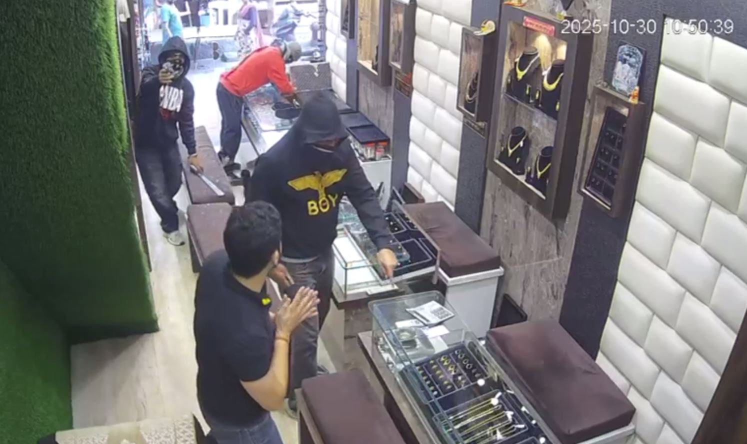 ਸਾਹਮਣੇ ਆਈ ਸੀਸੀਟੀਵੀ ਫੁਟੇਜ ਵਿੱਚ ਸਪਸ਼ਟ ਦਿਖਾਈ ਦੇ ਰਿਹਾ ਹੈ ਕਿ ਤਿੰਨ ਲੁਟੇਰੇ ਹੱਥਾਂ ਵਿਚ ਪਿਸਟਲ ਤੇ ਤੇਜ਼ਧਾਰ ਹਥਿਆਰ ਫੜ ਕੇ ਦੁਕਾਨ ਵਿੱਚ ਦਾਖਲ ਹੋ ਰਹੇ ਨੇ, ਜਿਨ੍ਹਾਂ ਨੂੰ ਵੇਖ ਕੇ ਦੁਕਾਨ ਮਾਲਕ ਦਾ ਪੁੱਤਰ ਘਬਰਾ ਗਿਆ ਅਤੇ ਉੱਚੀ ਆਵਾਜ਼ ਵਿੱਚ ਚੀਕਣਾ ਸ਼ੁਰੂ ਕਰ ਦਿੱਤਾ। ਇਸ ਦੌਰਾਨ ਇਕ ਲੁਟੇਰੇ ਨੇ ਤੇਜ਼ਧਾਰ ਹਥਿਆਰ ਨਾਲ ਕਾਊਂਟਰ ਦਾ ਸ਼ੀਸ਼ਾ ਤੋੜ ਦਿੱਤਾ, ਜਦਕਿ ਹੋਰ ਦੋ ਸਾਥੀ ਸ਼ੋਅ-ਕੇਸਾਂ ਵਿੱਚੋਂ ਗਹਿਣੇ ਸਮੇਟਣ ਲੱਗ ਪਏ। ਲੁਟੇਰਿਆਂ ਨੇ ਕਾਊਂਟਰ ਦਾ ਸ਼ੀਸ਼ਾ ਤੋੜ ਕੇ ਅੰਦਰੋਂ ਗਹਿਣੇ ਕੱਢੇ ਤੇ ਦੁਕਾਨ ਮਾਲਕ ਨੂੰ ਪਿਸਤੌਲ ਤਾਣ ਕੇ ਤਿਜੋਰੀ ਖੋਲ੍ਹਣ ਲਈ ਮਜਬੂਰ ਕੀਤਾ। ਤਿਜੋਰੀ ਵਿੱਚੋਂ ਨਕਦੀ ਕੱਢਣ ਤੋਂ ਬਾਅਦ ਉਹ ਹੋਰ ਸੋਨੇ ਦੇ ਗਹਿਣੇ ਵੀ ਬੈਗਾਂ ਵਿੱਚ ਪਾ ਲੈ ਗਏ। ਸਾਰੀ ਵਾਰਦਾਤ ਸਿਰਫ਼ ਦੋ ਮਿੰਟਾਂ ਦੇ ਅੰਦਰ ਹੋਈ। ਇਸ ਤੋਂ ਬਾਅਦ ਲੁਟੇਰੇ ਮੌਕੇ ਤੋਂ ਮੋਟਰਸਾਈਕਲ ’ਤੇ ਸਵਾਰ ਹੋ ਕੇ ਫਰਾਰ ਹੋ ਗਏ।
