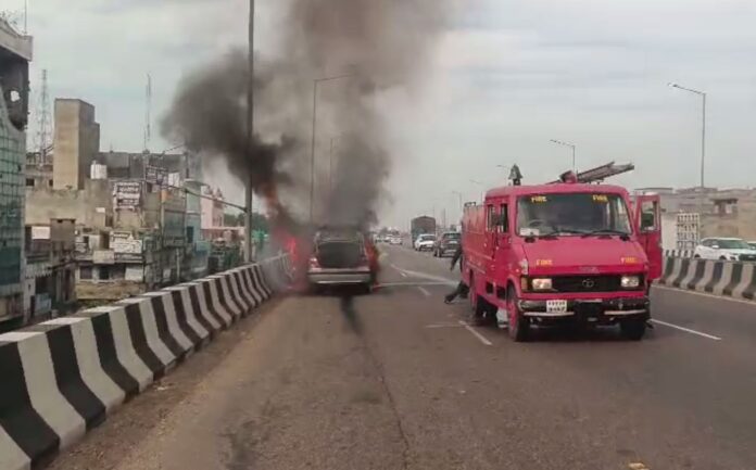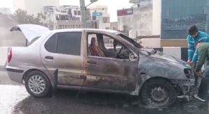 ਜਲੰਧਰ ਦੇ ਫਗਵਾੜਾ ਰੋਡ ਤੇ ਅੱਜ ਹਾਲਾਤ ਉਸ ਵੇਲੇ ਅਫਰਾ-ਤਫਰੀ ਵਾਲੇ ਬਣ ਗਏ ਜਦੋਂ ਇੱਥੋਂ ਲੰਘ ਰਹੀ ਇਕ ਕਾਰ ਨੂੰ ਅਚਾਨਕ ਅੱਗ ਲੱਗ ਗਈ। ਗਨੀਮਤ ਇਹ ਰਹੀ ਕਿ ਘਟਨਾ ਦਾ ਪਤਾ ਚੱਲਦੇ ਹੀ ਕਾਰ ਵਿਚ ਸਵਾਰ ਪਰਿਵਾਰ ਬਾਹਰ ਨਿਕਲ ਗਿਆ, ਜਿਸ ਕਾਰਨ ਜਾਨੀ ਨੁਕਸਾਨ ਤੋਂ ਬਚਾਅ ਹੋ ਗਿਆ ਪਰ ਕਾਰ ਦਾ ਅਗਲਾ ਹਿੱਸਾ ਸੜ ਕੇ ਸੁਆਹ ਹੋ ਗਿਆ। ਘਟਨਾ ਦੀ ਸੂਚਨਾ ਮਿਲਣ ਬਾਅਦ ਮੌਕੇ ਤੇ ਪਹੁੰਚੀ ਪੁਲਿਸ ਨੇ ਅੱਗ ਤੇ ਕਾਬੂ ਪਾਇਆ।