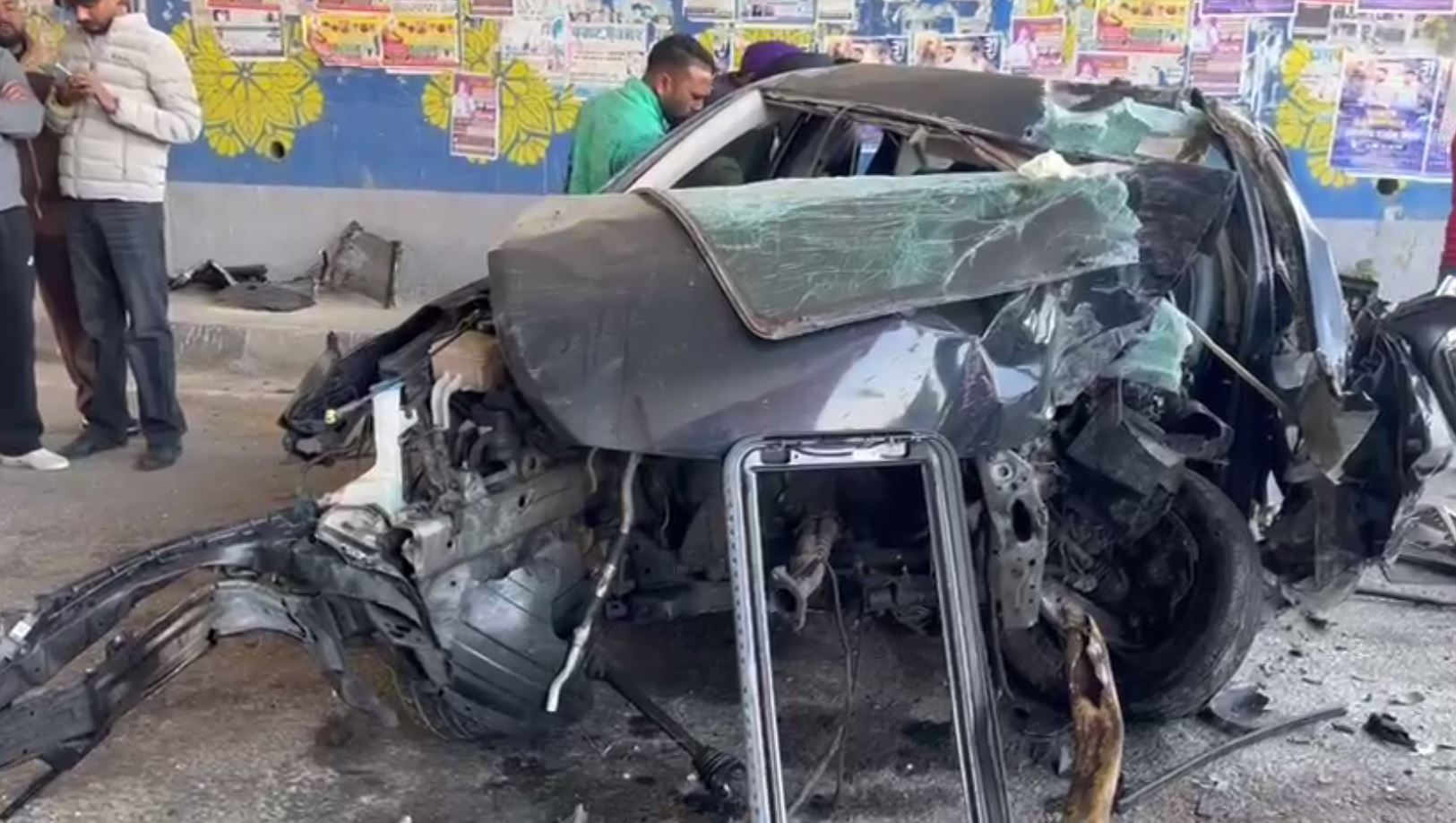 ਇਸੇ ਦੌਰਾਨ ਮੌਕੇ ਦੀਆਂ ਭਿਆਨਕ ਤਸਵੀਰਾਂ ਸਾਹਮਣੇ ਆਈਆਂ ਨੇ। ਕਾਰ ਬੂਰੀ ਤਰ੍ਹਾਂ ਚਕਨਾਚੂਰ ਹੋ ਚੁੱਕੀ ਹੈ ਅਤੇ ਕਾਰ ਦੇ ਇੰਜਨ ਤੇ ਹੋਰ ਕਲ-ਪੁਰਜੇ ਕਾਫੀ ਦੂਰ ਤੱਕ ਖਿੱਡੇ ਪਏ ਮਿਲੇ ਹਨ। ਮੌਕੇ ਤੇ ਮੌਜੂਦ ਲੋਕਾਂ ਨੇ ਘਟਨਾ ਲਈ ਸੜਕ ਮਹਿਕਮੇ ਨੂੰ ਜ਼ਿੰਮੇਵਾਰ ਦੱਸਿਆ ਐ। ਲੋਕਾਂ ਦਾ ਕਹਿਣਾ ਐ ਕਿ ਸੜਕ ਤੇ ਮਾਰਕਿੰਗ ਜਾਂ ਲਾਈਟਾਂ ਨਹੀਂ ਸੀ ਲੱਗੀਆਂ ਹੋਈਆਂ, ਜਿਸ ਦੇ ਚਲਦਿਆਂ ਹਨੇਰਾ ਹੋਣ ਕਾਰਨ ਕਾਰ ਸਿੱਧੀ ਕੰਧ ਨਾਲ ਟਕਰਾਅ ਗਈ ਐ। ਹਾਦਸੇ ਨਾਲ ਇਲਾਕੇ ਅੰਦਰ ਸੋਗ ਦੀ ਲਹਿਰ ਐ। ਪੁਲਿਸ ਨੇ ਲਾਸ਼ ਨੂੰ ਪੋਸਟ ਮਾਰਟਮ ਲਈ ਸਿਵਲ ਹਸਪਤਾਲ ਭੇਜ ਕੇ ਅਗਲ ਕਾਰਵਾਈ ਸ਼ੁਰੂ ਕਰ ਦਿੱਤੀ ਐ।