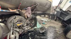 ਮੋਗਾ ਦੇ ਕਸਬਾ ਕੋਟ ਈਸੇ ਖਾ ਵਿਖੇ ਅੱਜ ਤੜਕਸਾਰ ਉਸ ਵੇਲੇ ਵੱਡਾ ਭਿਆਨਕ ਹਾਦਸਾ ਵਾਪਰ ਗਿਆ ਜਦੋਂ ਇੱਕ ਦੁੱਧ ਵਾਲਾ ਕੈਂਟਰ, ਇੱਕ ਟਰੱਕ, ਕਾਰ ਅਤੇ ਇੱਕ ਮੋਟਰਸਾਈਕਲ ਵਿਚਾਲੇ ਟੱਕਰ ਹੋ ਗਈ। ਹਾਦਸਾ ਇੰਨਾ ਭਿਆਨਕ ਸੀ ਕਿ ਮੋਟਰਸਾਈਕਲ ਚਾਲਕ ਦੁੱਧ ਵਾਲੇ ਕੈਂਟਰ ਅਤੇ ਟਰੱਕ ਦੇ ਵਿਚਕਾਰ ਹੀ ਫਸ ਗਿਆ ਜਿਸ ਦੀ ਮੌਕੇ ਤੇ ਹੀ ਮੌਤ ਹੋ ਗਈ। ਟਰੱਕ ਚਾਲਕ ਵੀ ਅੰਦਰ ਹੀ ਫੱਸ ਗਿਆ ਸੀ, ਜਿਸ ਨੂੰ ਬੜੀ ਮਸ਼ੱਕਤ ਤੋਂ ਬਾਅਦ ਬਾਹਰ ਕੱਢਿਆ ਗਿਆ। ਹਾਦਸੇ ਤੋਂ ਬਾਅਦ ਮੌਕੇ ਦੀਆਂ ਭਿਆਨਕ ਤਸਵੀਰਾਂ ਸਾਹਮਣੇ ਆਈਆਂ ਹਨ। ਜ਼ਖਮੀਆਂ ਨੂੰ ਮੋਗਾ ਦੇ ਸਿਵਲ ਹਸਪਤਾਲ ਵਿੱਚ ਭਰਤੀ ਕਰਵਾਇਆ ਗਿਆ ਐ।
