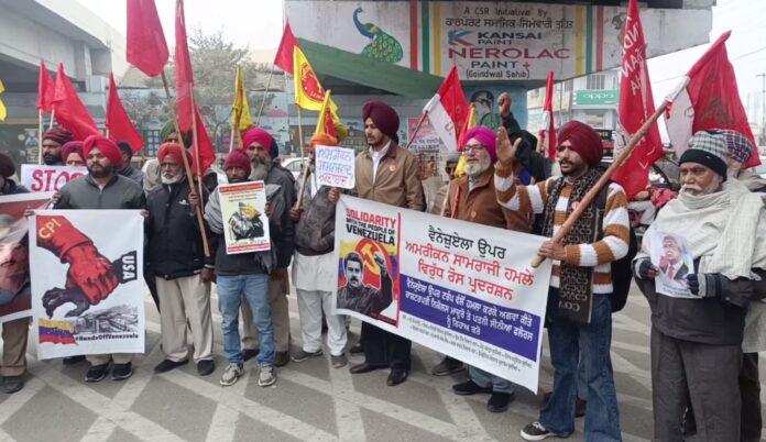 ਮੋਗਾ ਵਿੱਚ ਕਮਿਊਨਿਸਟ ਪਾਰਟੀਆਂ ਦੇ ਸੱਦੇ ’ਤੇ ਵੈਨਜ਼ੂਏਲਾ ਦੇ ਰਾਸ਼ਟਰਪਤੀ ਨਿਕੋਲਸ ਮਾਦੁਰੋ ਅਤੇ ਉਸ ਦੀ ਪਤਨੀ ਨੂੰ ਅਗਵਾ ਕਰਨ ਦੇ ਅਮਰੀਕੀ ਦੋਸ਼ਾਂ ਦੇ ਵਿਰੋਧ ਵਿੱਚ ਅਮਰੀਕੀ ਰਾਸ਼ਟਰਪਤੀ ਦਾ ਪੁਤਲਾ ਫੂਕਿਆ ਗਿਆ। ਇਸ ਮੌਕੇ ਸ਼ਹੀਦ ਨਛੱਤਰ ਸਿੰਘ ਧਾਲੀਵਾਲ ਭਵਨ ਮੋਗਾ ਵਿਖੇ ਸੈਂਕੜੇ ਵਰਕਰ ਇਕੱਤਰ ਹੋਏ। ਪ੍ਰਦਰਸ਼ਨ ਨੂੰ ਸੰਬੋਧਨ ਕਰਦਿਆਂ ਭਾਰਤੀ ਕਮਿਊਨਿਸਟ ਪਾਰਟੀ ਦੇ ਜ਼ਿਲ੍ਹਾ ਸਕੱਤਰ ਕੁਲਦੀਪ ਸਿੰਘ ਭੋਲਾ ਅਤੇ ਕਰਮਜੀਤ ਕੌਰ ਨੇ ਕਿਹਾ ਕਿ ਅਮਰੀਕੀ ਫੌਜਾਂ ਵੱਲੋਂ ਅੰਤਰਰਾਸ਼ਟਰੀ ਕਾਨੂੰਨਾਂ ਦੀ ਉਲੰਘਣਾ ਕਰਦਿਆਂ ਵੈਨਜ਼ੂਏਲਾ ਵਿੱਚ ਦਖ਼ਲ ਦੇਣਾ ਅਤੇ ਉਥੋਂ ਦੇ ਰਾਸ਼ਟਰਪਤੀ ਤੇ ਉਸ ਦੀ ਪਤਨੀ ਨੂੰ ਅਗਵਾ ਕਰਨ ਦੀ ਕੋਸ਼ਿਸ਼ ਕਰਨਾ ਖੁੱਲ੍ਹੀ ਗੁੰਡਾਗਰਦੀ ਅਤੇ ਲੋਕਤੰਤਰ ਦਾ ਕਤਲ ਹੈ।